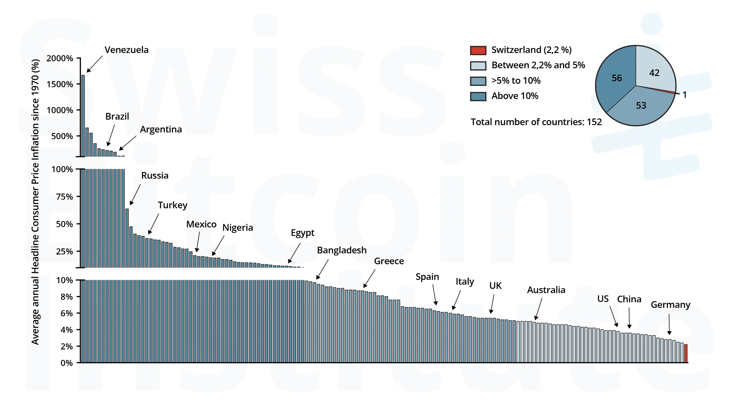 Figure 1: Average annual inflation of 152 countries since 1970. Since the end of Bretton Woods, no country has averaged less than 2% inflation. Switzerland, at 2.2%, comes closest. 42 countries have averaged between 2,2% and 5%; 53 greater than 5% and up to 10%; 56 countries above 10%. Source: World Bank, A Global Database of Inflation, 2025 [9].