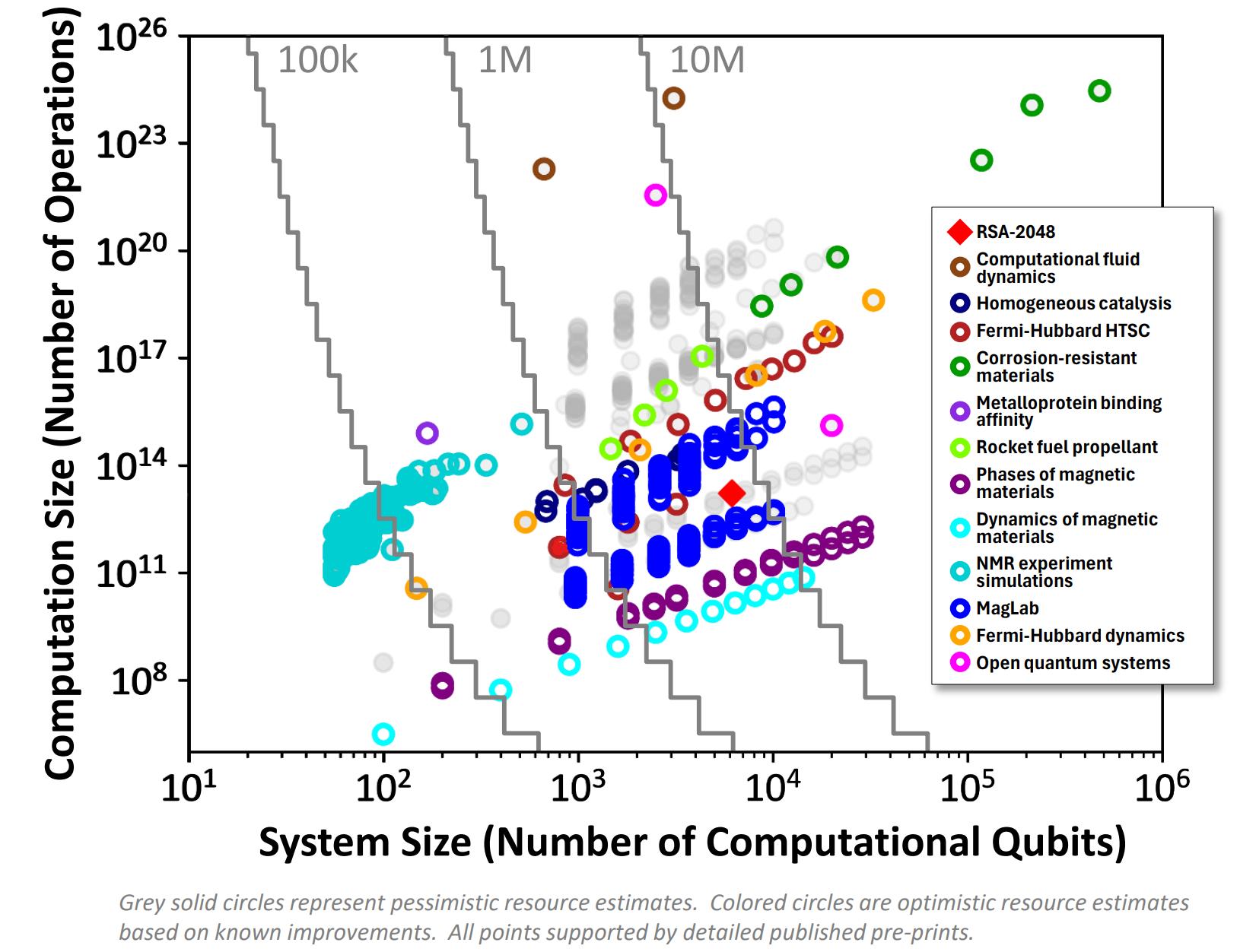 Figure 2: DARPA's Quantum Benchmarking Results. The chart plots various quantum applications by required system size (qubits) and computation size (operations). Note that security decryption tasks like breaking RSA and ECDSA (solid red diamond and circle, respectively) are located in the lower-left quadrant, indicating they are among the least difficult problems for a CRQC. Source: DARPA QBI Proposers Day, 2024. [5]