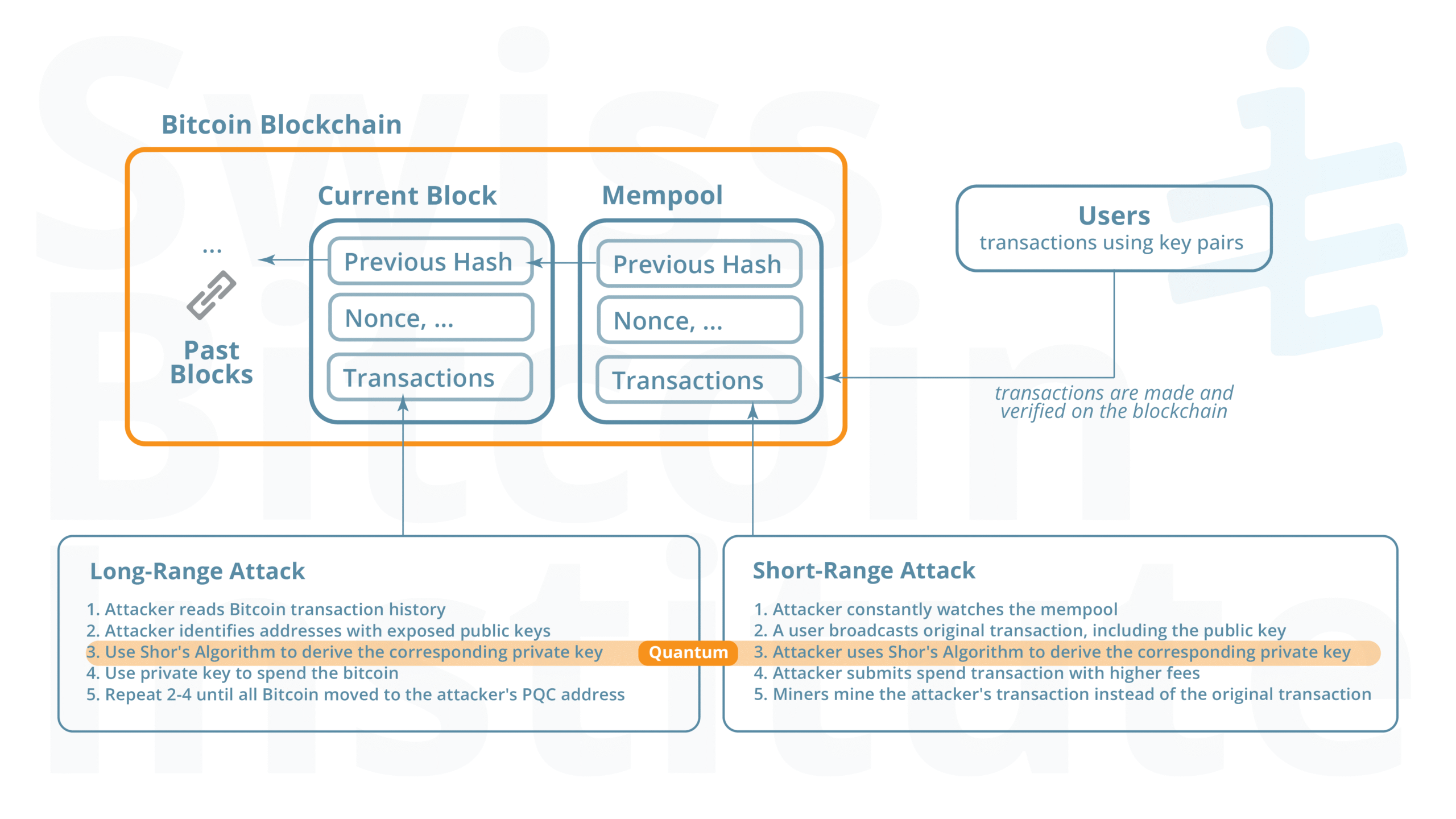 Figure 1: Long-Range vs. Short-Range Attack Vectors. The diagram illustrates the two primary methods a quantum attacker could use to steal bitcoin. Long-range attacks target funds where the public key is already exposed on the blockchain, while short-range attacks target new transactions as they are broadcast to the network.